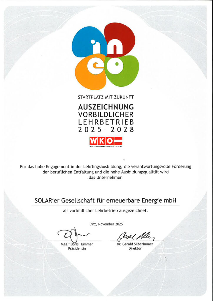Die SOLARier Gesellschaft für erneuerbare Energie mbH wurde erneut von der WKO Urfahr-Umgebung als vorbildlicher Lehrbetrieb ausgezeichnet.