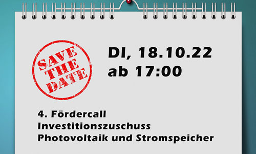 FÖRDERCALL am 23.03.2023 ab 17.00 UhrGefördert wird die Neuerrichtung und Erweiterung von Photovoltaikanlagen und die damit verbundene Neuerrichtung von Stromspeichern. Nach der derzeitigen gesetzlichen Ausgestaltung ist keine Mindestgröße für die Erweiterung einer PV-Anlage definiert. Förderanträge für Investitionszuschüsse nach dem Erneuerbaren-Ausbau-Gesetz (EAG) kannst